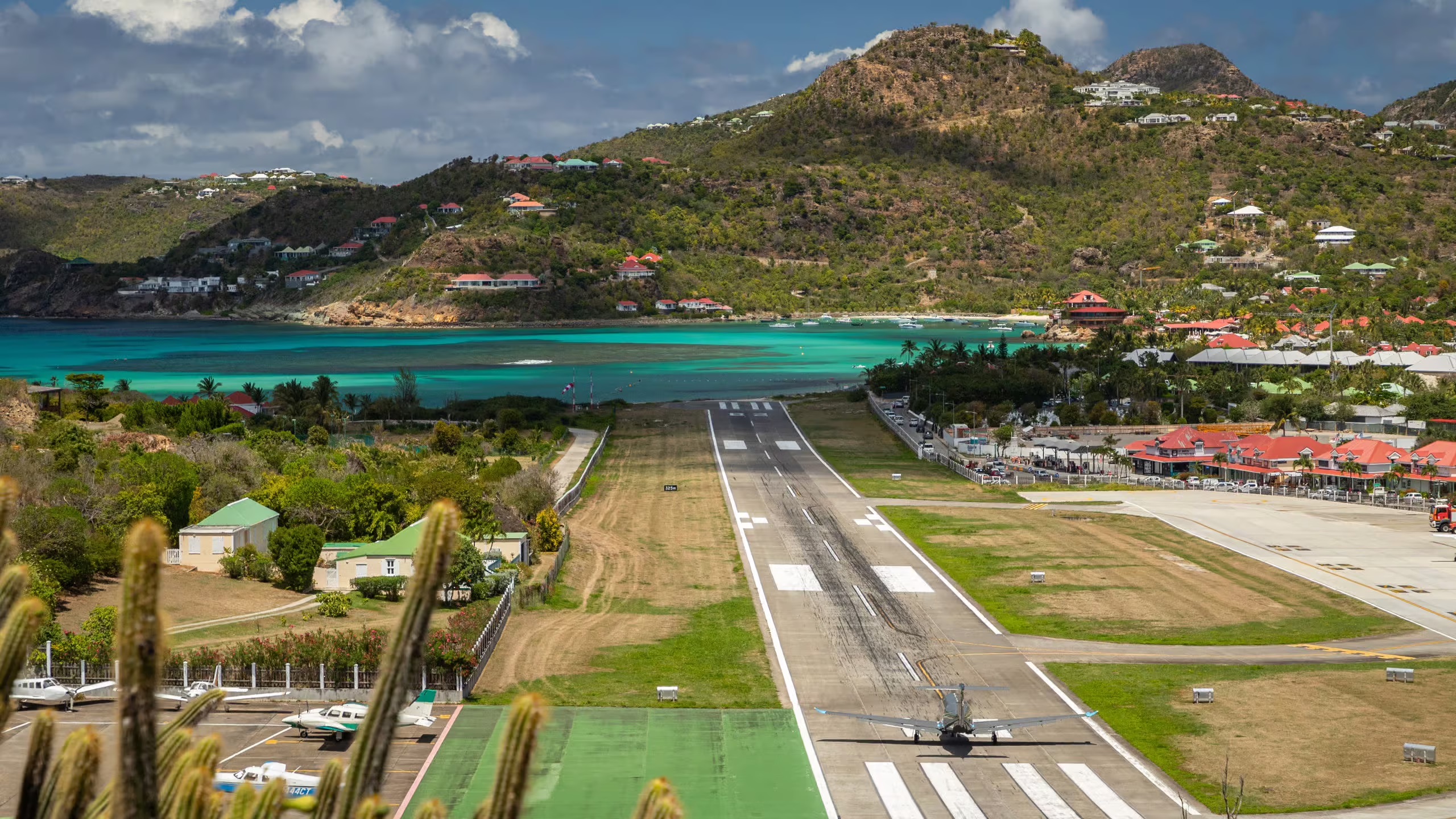 Gustaf III Airport op Saint Barth heeft een van de kortste landingsbanen van de Caribbean – 646 meter. Het vliegtuig daalt steil over een heuvel en landt vlak naast het strand van Saint Jean. Alleen speciaal gecertificeerde piloten mogen hier landen. Het is veilig, maar de landing is een belevenis die je bijblijft.